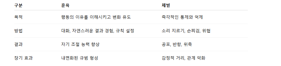 반면, 훈육은 아이의 이해와 공감, 자기 성찰 능력을 키우는 교육입니다.