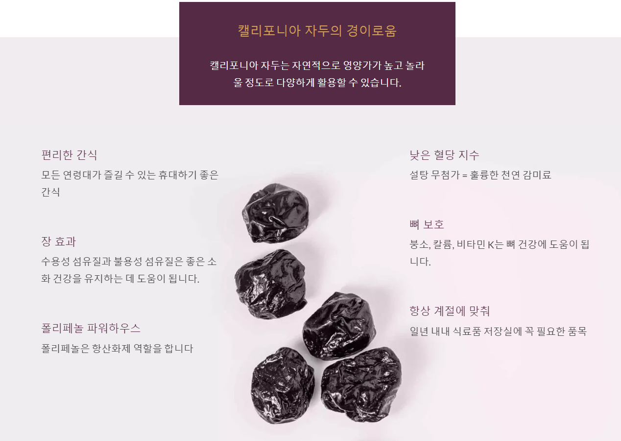 푸룬은 무콜레스테롤, 무나트륨, 무지방, 무설탕 식품으로 가공 없이도 건강하게 섭취할 수 있어 바쁜 현대인들에게 적합한 간편식으로도 주목받고 있습니다. 특히 외출 시에도 휴대하기 쉬운 간편 포장으로 일상 속 건강 관리를 실천할 수 있습니다.