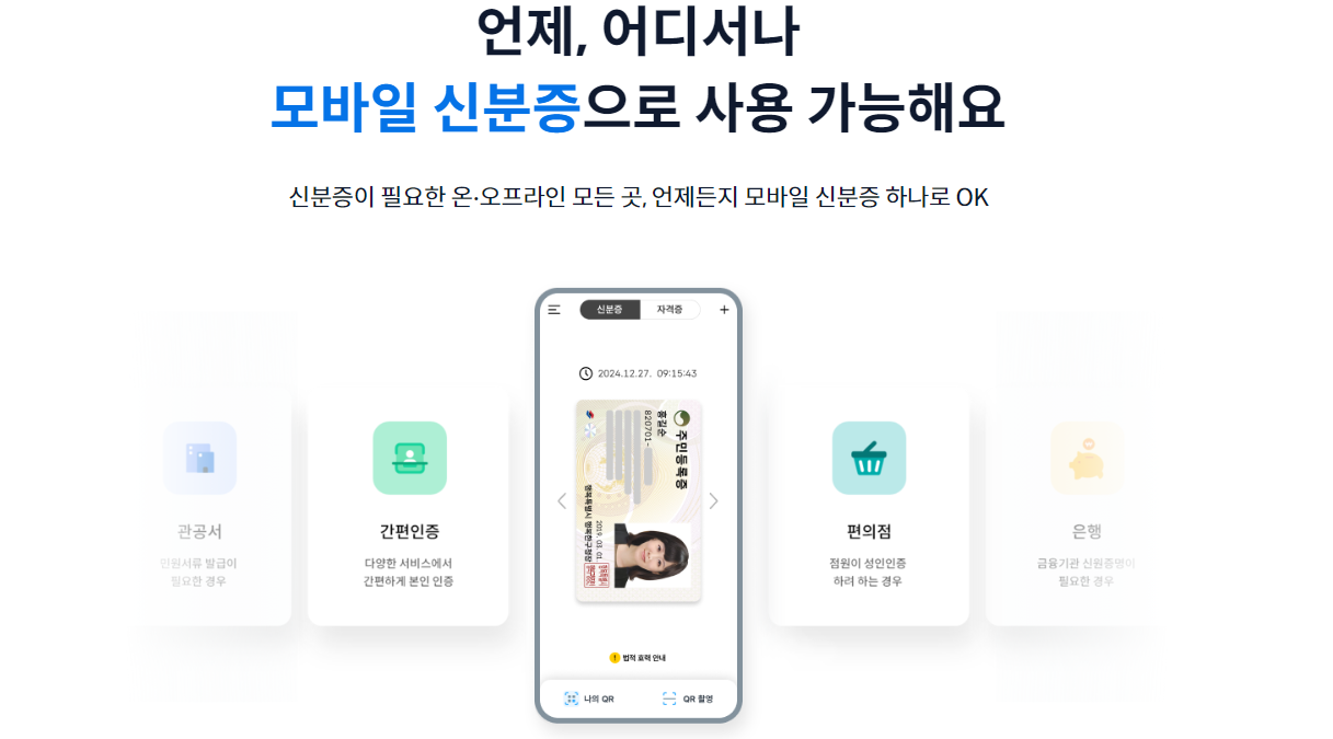 발급 이후에는 오프라인에서도 QR코드, 바코드, NFC 등을 통해 신분을 증명할 수 있고, 온라인 서비스에서도 사용할 수 있습니다.