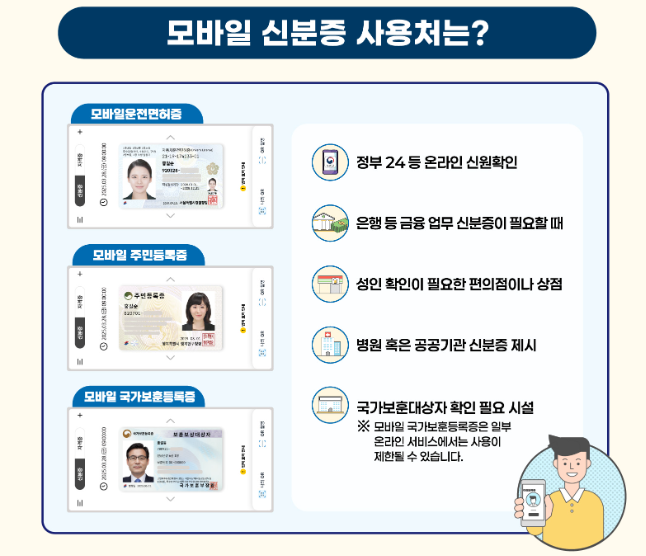현재 대한민국에서는 모바일 운전면허증과 모바일 주민등록증이 가장 대표적인 모바일 신분증입니다.